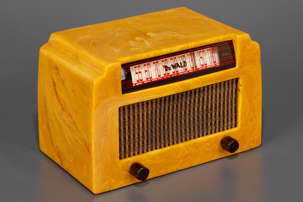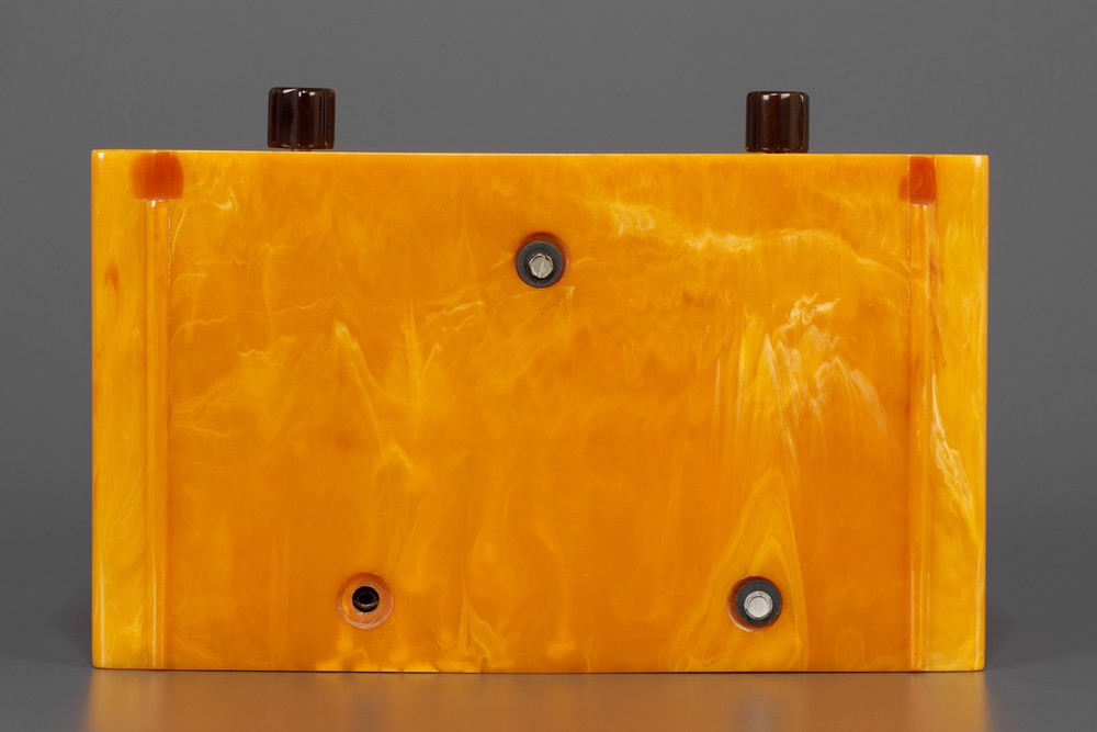 The catalin cabinet has a rich bright color, and glow combined with striking yellow and orange-brown marbleizing. The beautiful radio is just a great example of this DeWald model.