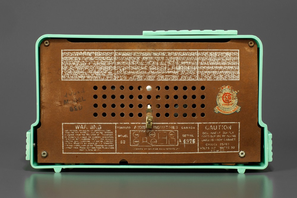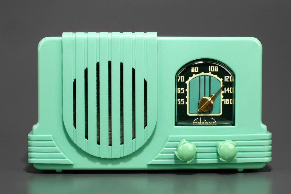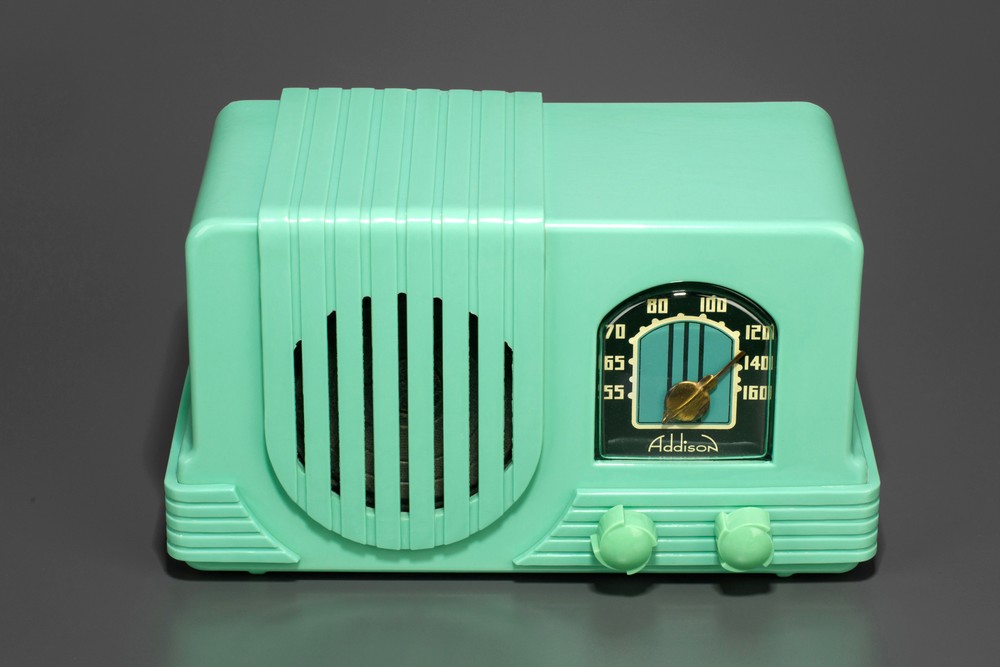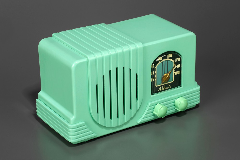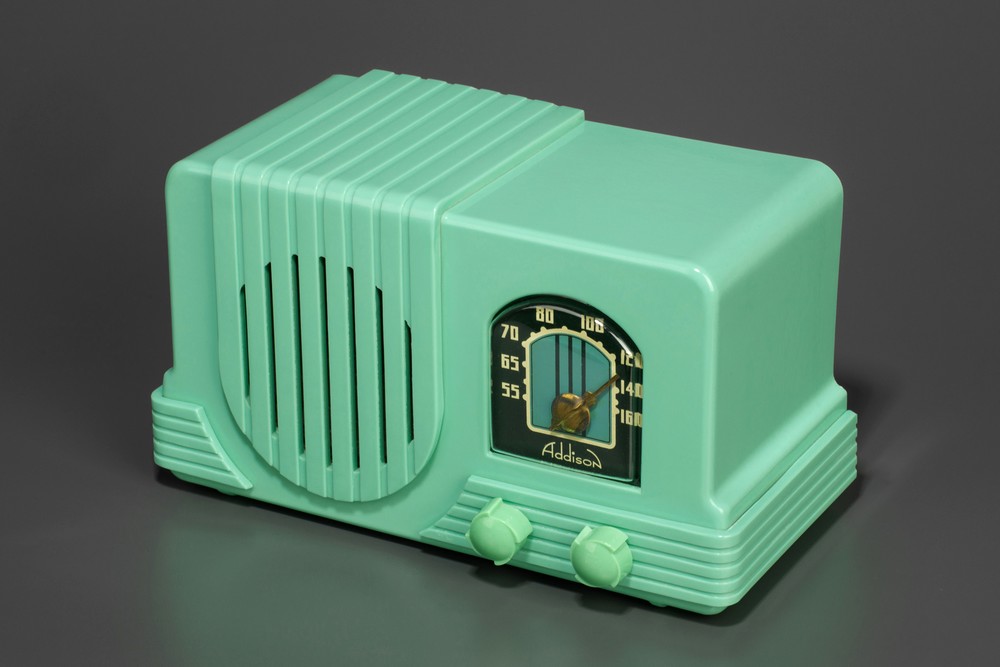 Mint Green Plaskon Addison 2 "Waterfall" radio made circa 1940 by Addison Industries Limited in Canada. Collectors consider this color combination to be the rarest. The unique styling + bold use of color would make this radio a truly beautiful addition to any collection. This stylized Art Deco radio features the famous "waterfall" speaker grill trim and surround "bumpers" with speed-lines that really make for a streamlined radio design. If you are looking for a great addition to your collection, please consider this beauty.