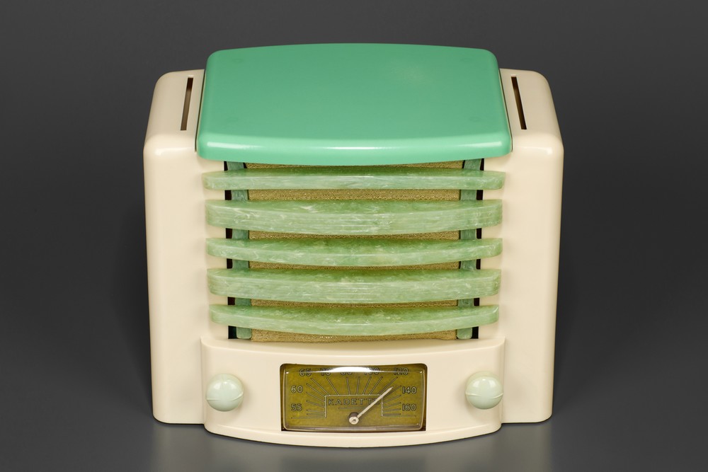 This radio is in original, untouched condition, with a beautiful and natural gloss. The ivory cabinet and green top are in great condition with no cracks, chips, tube burns or repairs; it's really a great example. The fragile tenite grills have some of the warp that is common to this radio’s grilles. Knobs are original to the radio and also in great condition. Cardboard bottom panel with manufacturers sticker is original to the radio and in great condition. Dial plastic and grill cloth are a correct replacements. This beautiful KADETTE has been well taken care of and has very few small scratches consistent with light use. This great radio would make a great addition to any radio or Art Deco collection.