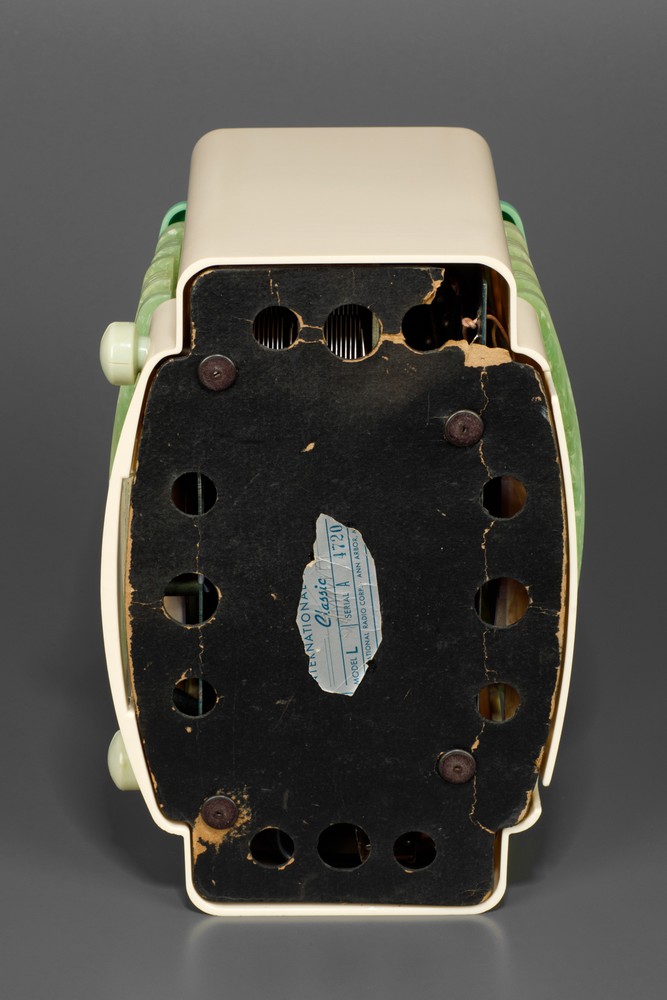Beautiful and scarce Kadette K-12 ‘Classic’ made in 1936 by the International Radio Corporation of Ann Arbor, Michigan. This example with its ivory body and green colored top made of plaskon and a marbled green tenite grill and knobs is rather striking. Ads of the time boasted that this was the first radio made from 3 different plastics. An interesting radio that was designed to be viewed from all angles, with the back of the radio similar to the front. Their aesthetic appeal and scarcity have made these rare to find. With its heavy chassis and closed design that retained heat combined with the fragility of the plaskon cabinets, most didn't survive and the ones that surface usually have cabinet damage. It is difficult to find an example that is in good condition.