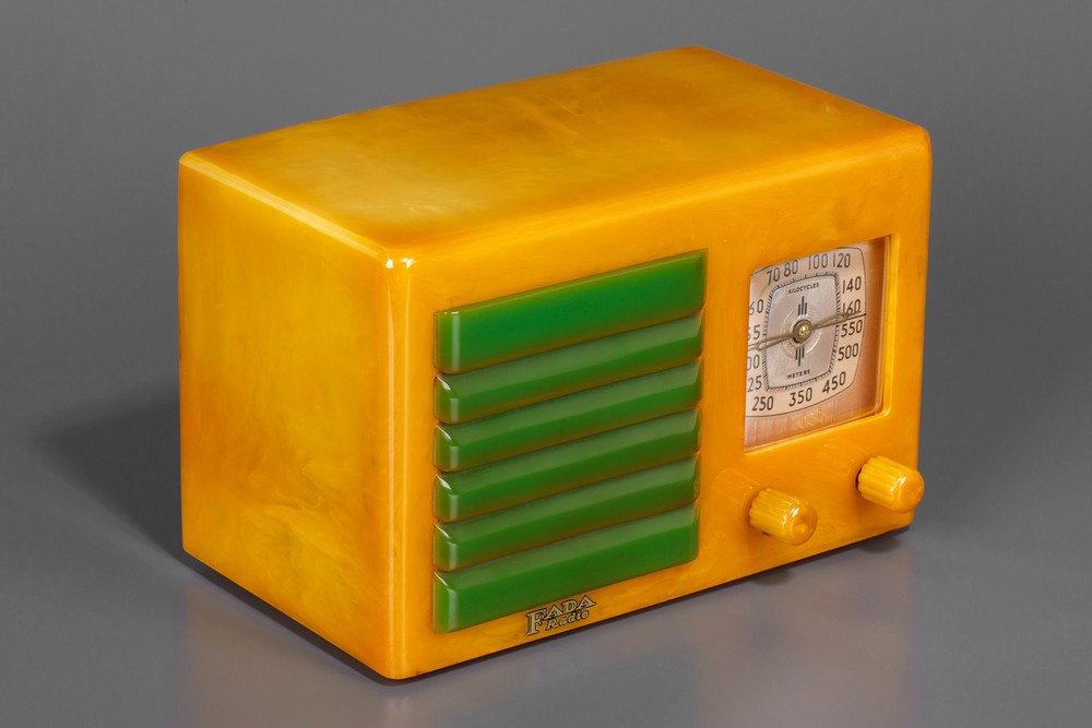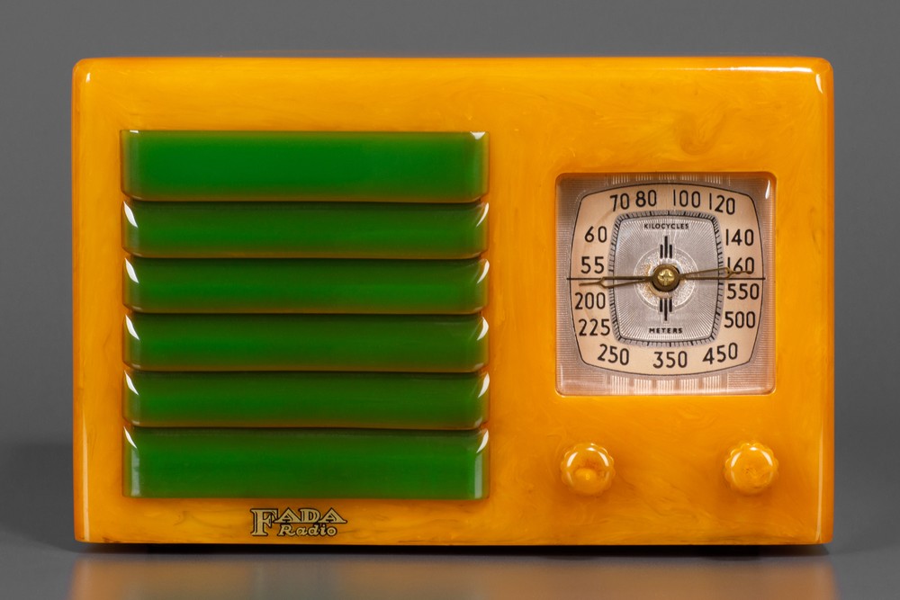 Striking + Rare Fada 5F60 Catalin radio in marbleized yellow with a bright green insert grill. This rare prewar 1936/37 is one of the earliest catalin radio models made and has a simple and distinct cabinet design. This yellow + green example is all-original and in great condition with a beautiful glossy finish. This is a striking color combination for this radio. This model has come to be known to collectors as the 'Baby Fada' because of its small size.