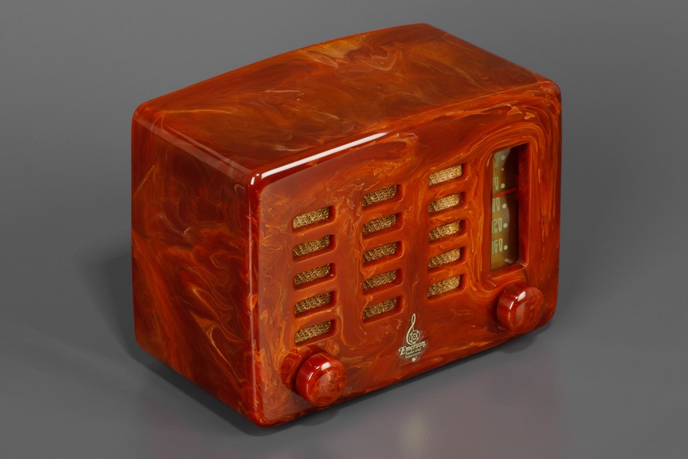 Superbly marbleized oxblood Catalin Emerson model 564 'Slot-Grill'. This radio is a magnificent Art Deco radio that features and vertical slide rule dial + a series of symmetrical grill cut-outs. Emerson Radio & Phonograph Corp, out of New York, manufactured this small Catalin radio in 1940.v