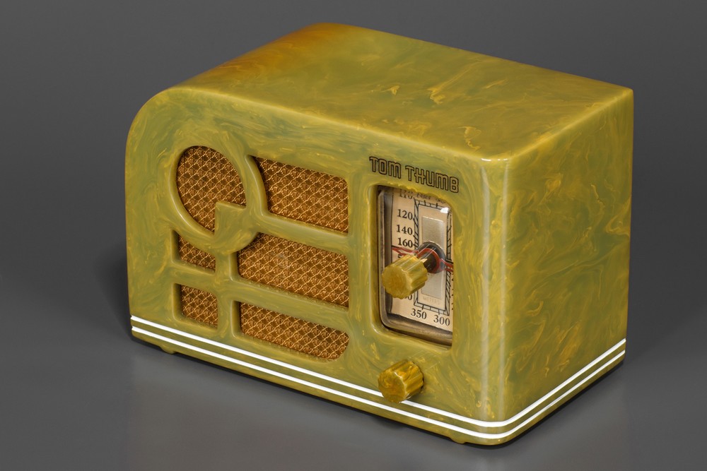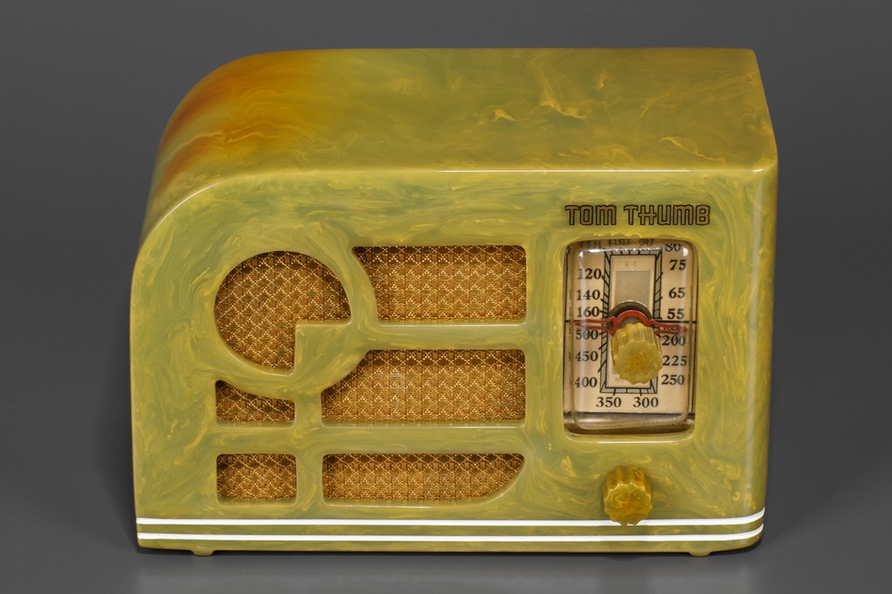 Catalin cabinet has no cracks, chips, or repairs. Radio has the common tube burn found on Tom Thumbs due to small size of the radio. The original matching. catalin knobs have great marbleizing. Radio retains the light blue painted stripes that wrap around the cabinet. Radio has the original gold grill cloth in beautiful condition. Water-slide decal and dial plastic are correct replacements. This is a great example of an all original early + rare 'Deco' Tom Thumb catalin radio.