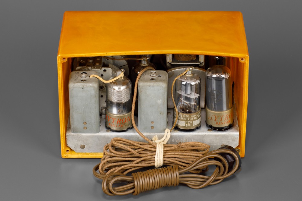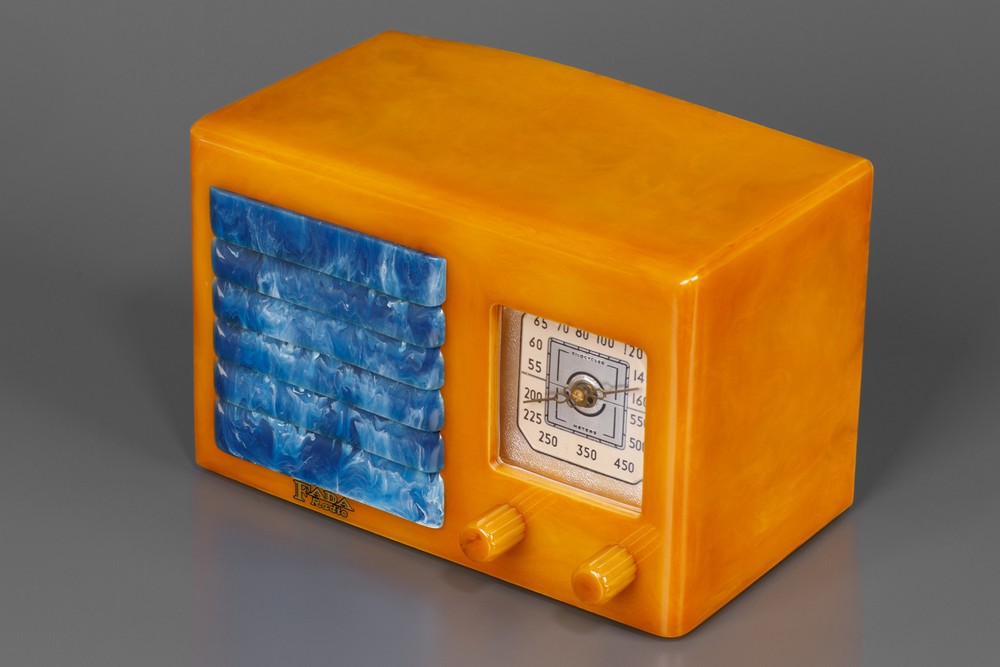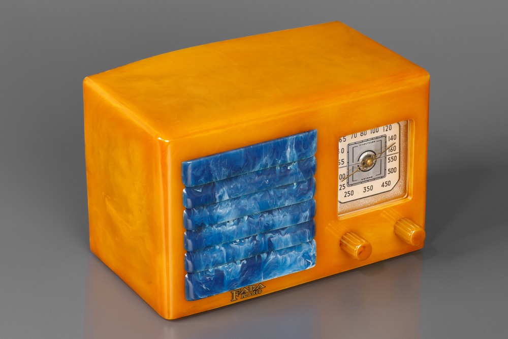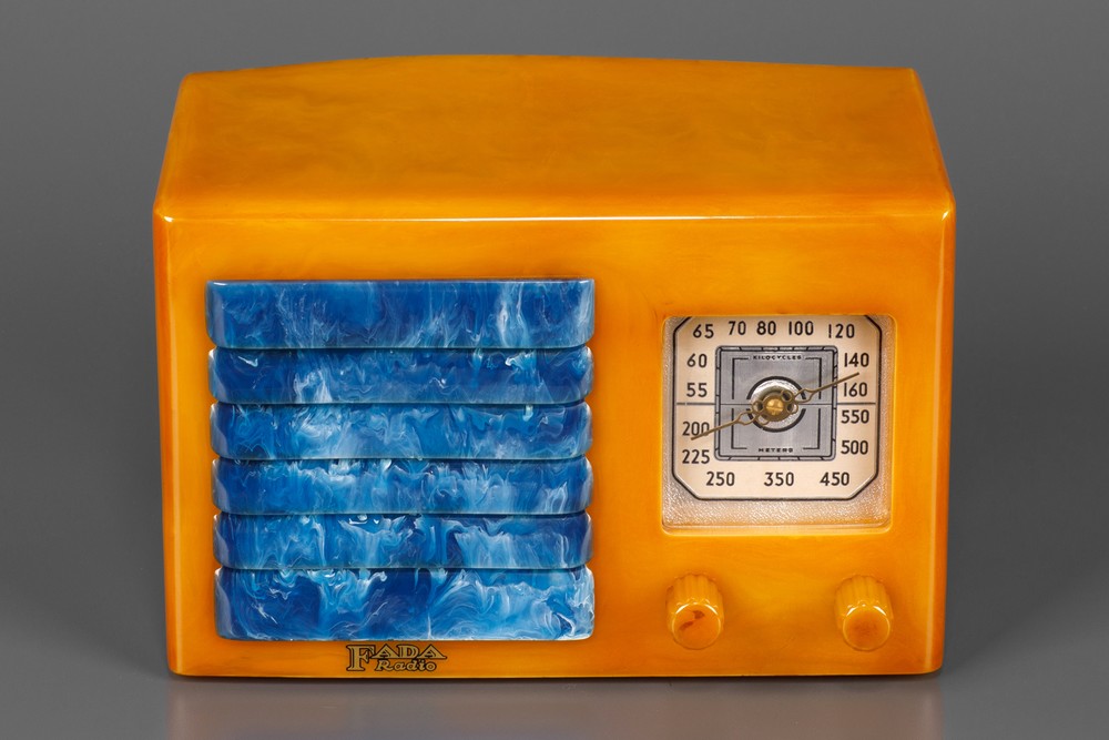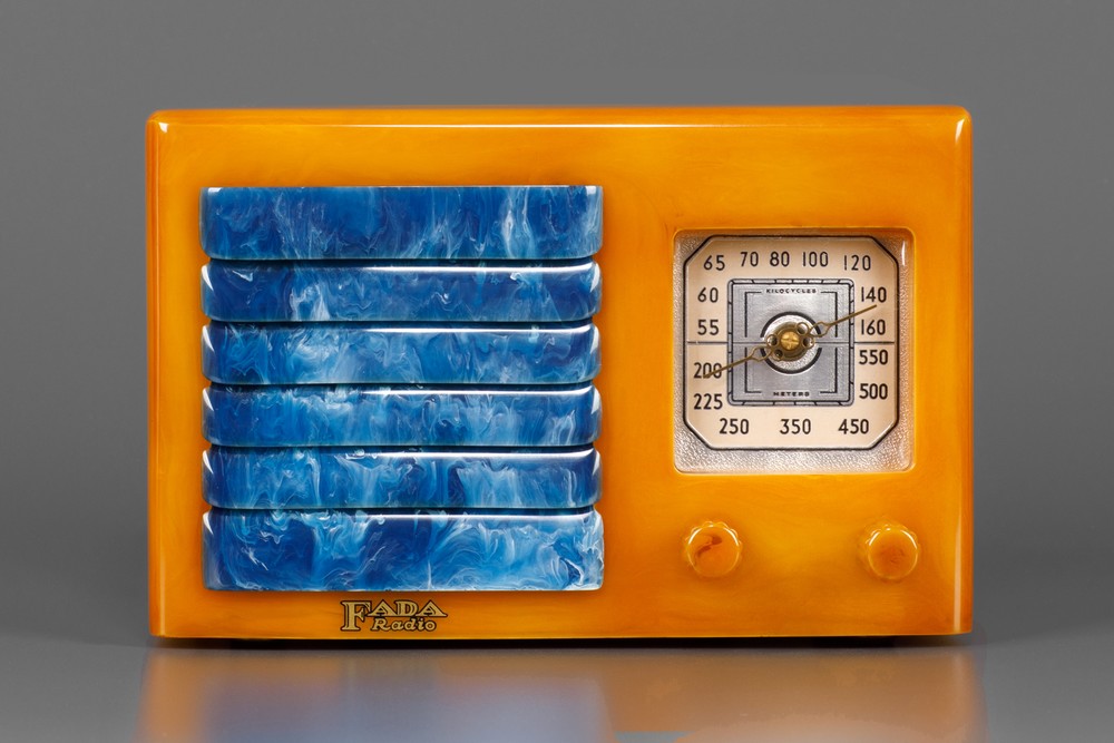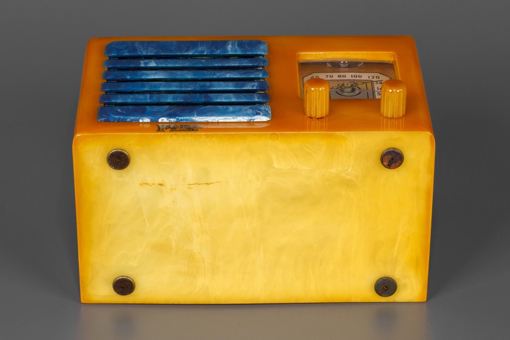 Early Fada 5F60 Catalin radio in faintly marbleized yellow with a beautifully marbleized lapis lazuli blue insert grill. This prewar 1936/37 is one of the earliest catalin radio models made and has a simple and distinct cabinet design. This yellow + blue example is all-original and in great condition with a beautiful glossy finish. The lapis lazuli grill has striking white and blue marbleizing that gives it depth. This model has come to be known to collectors as the 'Baby Fada' because of its small size.