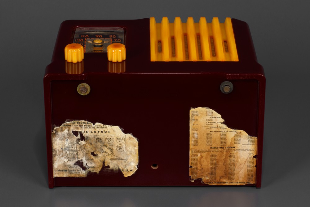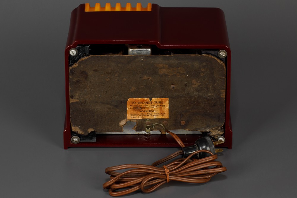 The glossy + deep maroon catalin cabinet is in excellent condition with no cracks, damage, tube burns, or repairs. The yellow catalin waterfall grill and 'tractor wheel' knobs trim is complete and factory original to the radio. Trim has no cracks, chips, burns or repairs. The beautiful graphic dial is bright and in great condition. Radio retains the original manufactures labels still affixed to the bottom of cabinet and grill cloth and the original back panel. The dial plastic is a correct replacements.